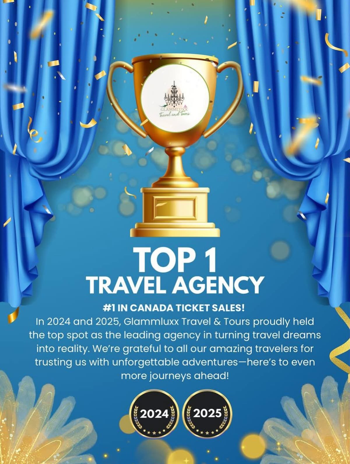 Glammluxx Travel & Tours Inc, is a travel agency located in Swift Current Saskatchewan Canada. Operating since November 2023. Our Host Agency is Alexis International Travel. We are Bbb accredited, Canadian Choice Award Winner for 2024 and 2025 for Travel Agency Category. We were seen on OMNI NEWS Channel here in Canada, it means our agency is trusted our expertise by media outfits for any travel related news.